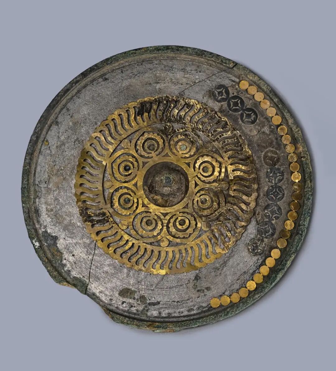 此镜出土时从中部断裂,镜子呈圆形,有半球形钮,镜背贴布髹漆。围绕镜钮最内层为八瓣心形金片宝相花纹,每瓣为三重,最内重中心处为绿色玻璃珠;宝相花纹外为一周镂空曲栉齿环带;最外层为一周银片圆形方孔钱纹和一周金片联珠纹,制作精细、纹样繁复,这绝非普通人能用上的器物。
