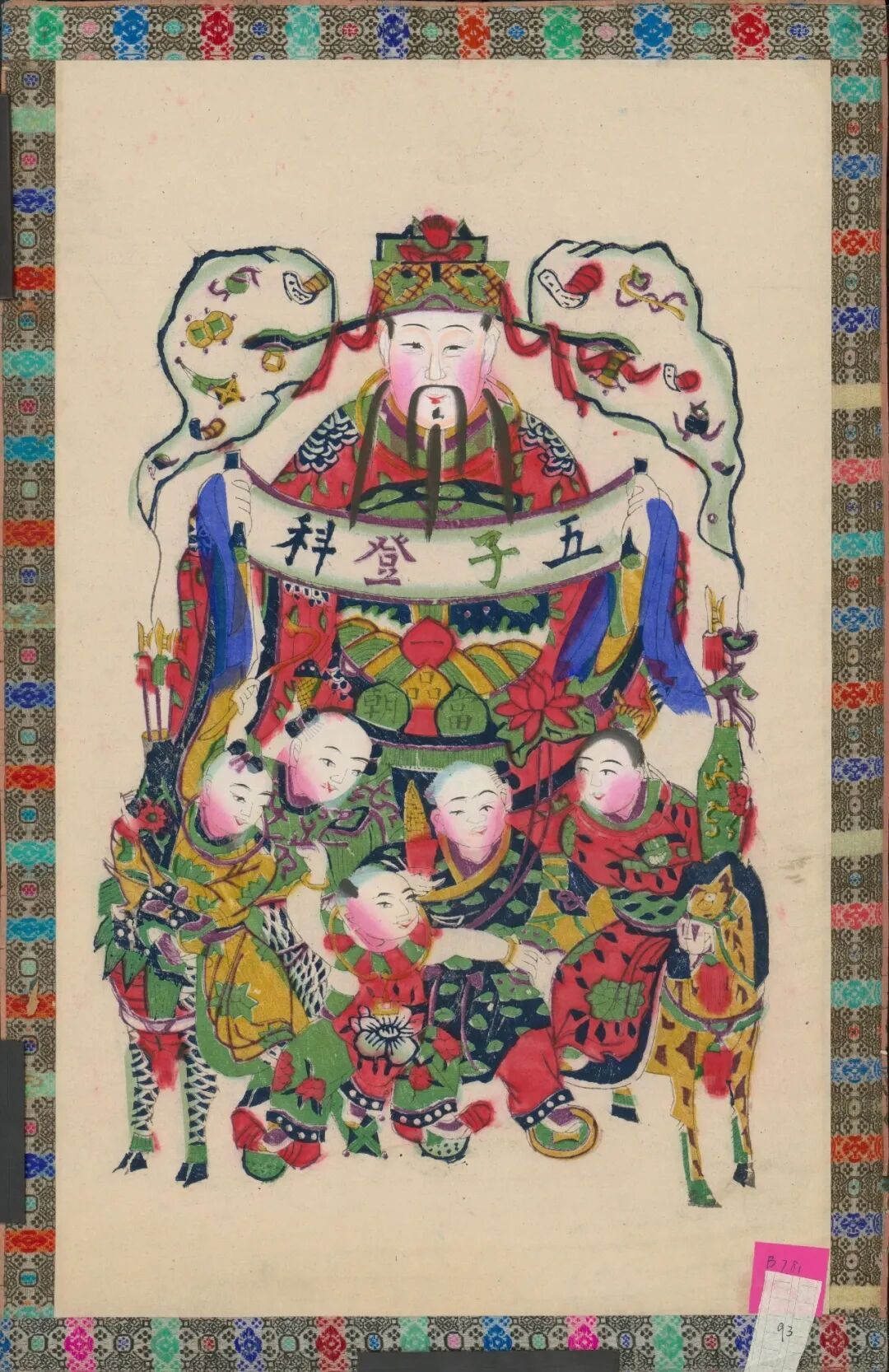 印版《五子登科文门神码》,此幅为民间年画,“五子登科”图案有着吉祥的寓意,希冀多子多福,子嗣登科致仕,光宗耀祖。来源/故宫博物院