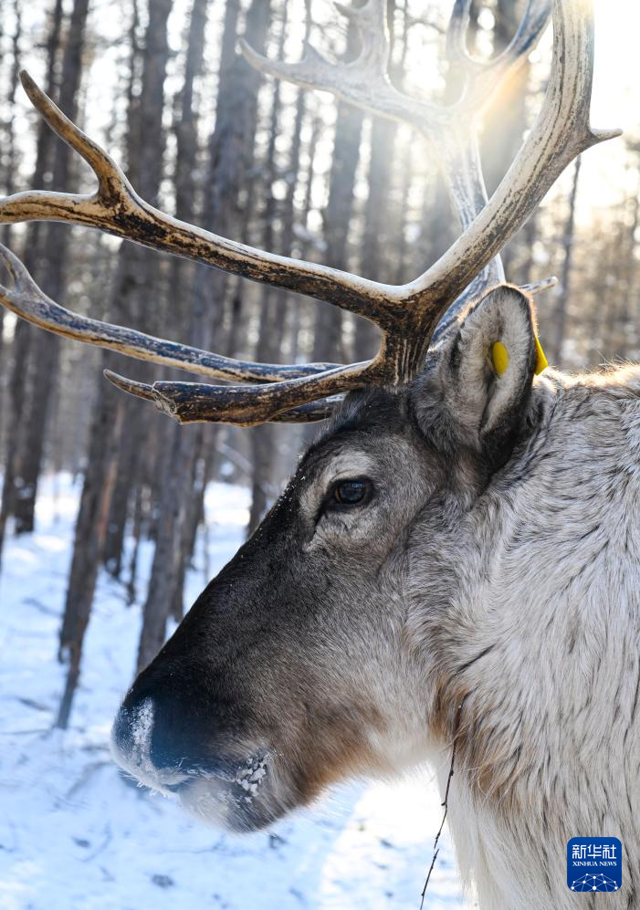 这是1月15日在根河市敖鲁古雅鄂温克民族乡敖鲁古雅使鹿部落景区拍摄的驯鹿。新华社记者 徐嘉懿 摄